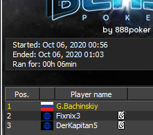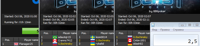 Турнир получился на 8 раздач, 3 выиграл, 3 проиграл и 2 выиграл... Так зашел выиграть, думаю серию турниров сыграть, но после победки не так хочется, но надо.... Вчера соперник закрыл день в 11:22 p.m. на серии из 4х побед 10го лимита...