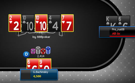 Мтт за 0,5 не пошел, было раза три мог стек удвоить, но также и слить, то топ пару скинул на терне с 5кой кикером, зачем тогда заходить, соперники показали "ничего"... То на терне скидываю гатшот, не по шансам кол, он закрывается ривером... То другой гатшот закрывается ривером, давая соперникам к флешу карту, но у них ничего... А после, перестало заходить и запушил 88 12бб на блайндах /300, точнее затрибетпушил в опенрейзера из утг на ТТ, считай не заметил его, даже следом за ТТ утг 2 зашел с QJ и поймал даму на терне, то есть запушил в двоих... Значит заметил, в банке было 2,6к, а в стеке 3,6к, а достаточно 20% от стека, чтобы пуш был норм, как понимаю..