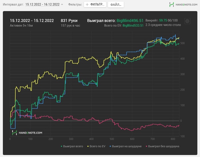 На финалке не сложилось. Оппы норм попались. Интересно с ними было играть. Один опп, чипак узбек, в с 2018 года до 2021 сыграл хуеву тучу турниров в сравнительно не большой плюс. Скорее всего МТСНГ, так как плавная линия. В 2021 занял второе место в СМ КО на Покерстарс. +81500$ С тех пор играет не дороже 11 баксов, но хорошо плюсует. Ему я в итоге и слил с A8s < KK. Ну хоть не бразильянцу. Не люблю я их. Сам не знаю почему. Теперь многие из них не любят казахов🤣
