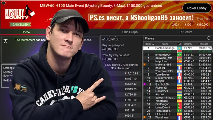 На финальном столе MBW-60: €100 Main Event на PS.es произошёл неожиданный поворот: когда в турнире осталось 6 человек, рум... просто завис ❌