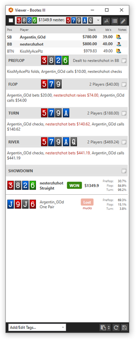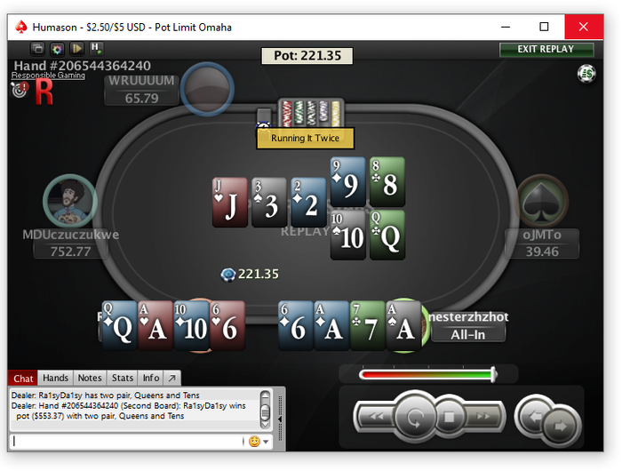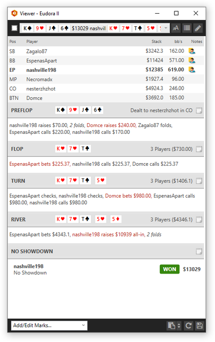 lakem0de, Мне еще абсолютно не понятен сайзинг лида ББ. Он имеет в виду сильно полярный ренж по ходу. Тогда после его колла на терне у него нет средних рук, остались только сеты и слоуплей - нат - флаши, а какие-то свои блефы он выбросил. На ривере после его пот бета в 250 ББ у него никогда нет блефов, если он не принимал упорон перед сессией. А его сайз на флопе говорил о том, что там сильно полярный ренж. То есть это всегда КК. Но видимо у него все-таки ТТ, так как он посчитал, что ТТ могут быть частью его вот такого полярного спектра флопа. Тут еще нельзя исключать, что он все же принял упорон, и там какие-то AhKxx, которые он планировал блеф-рейзить бланки и блеф-лидить спарки на ривере.