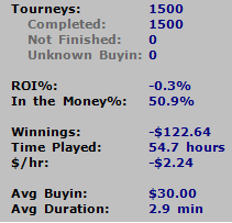 Говоря по-русски, я не умею играть Супер Турбо на двух столах. Играя один стол в этом месяце я имею 3.7% РОИ, а играя два - - 2.6%. Тоже самое и на полной дистанции в 4.000 игр. На одном столе РОИ = 2.8%; на двух - - 1.3%.