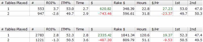Первые две строчки на картинке - это за этот месяц, а ниже общая картина за всё время на PS: Говоря по-русски, я не умею играть Супер Турбо на двух столах. Играя один стол в этом месяце я имею 3.7% РОИ, а играя два - - 2.6%. Тоже самое и на полной дистанции в 4.000 игр. На одном столе РОИ = 2.8%; на двух - - 1.3%.