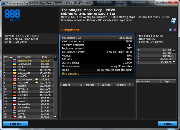 IPoker Network No Limit Hold'em Tournament - t125.00/t250.00 Blinds - 6 players - View hand 1632709