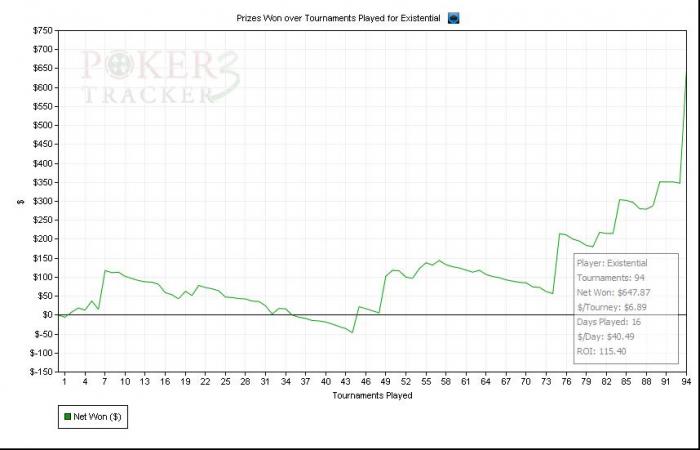 Ну и решил на пpощание сыграть десяточку. Не турбо (под рукой не оказалось), а аж по 15 мин уровни, с лейт регой на целый час (да, я воспользовался!). И, короче, там вообще какие-то невероятные раздачи происходили, очень многому научился. Даже один раз посмотрел, не ошибся ли я БИном: $10 там или $100??