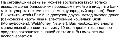 А в чем проблема то? Вывод разрешили. Чем недоволен? Если нет метода вывода то и вывода денег нет. Вывод разрешили а выводить то некуда. Кинь 10 долларов на вэбмани и выводи спокойно.