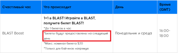 Чтобы получить билеты BLAST, предоставленные в рамках акции BLAST BOOST, вы должны ответить на эл. письмо с заявлением, отправленное 888poker, нажав на соответствующую ссылку в таком эл. письме в течение 24 часов с момента отправки его вам 888poker. Если вы не нажмете на соответствующую ссылку в указанный срок, вы автоматически потеряете право на получение BLAST BOOST.