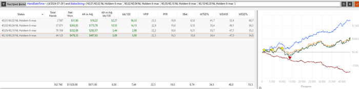На графике дистанция в 7 месяцев. Это чистая 25ка. Сразу говорю, я и до Жени плюсовал в 6.5бб/100, но у меня была куча «плохих привычек», но плюсовал я исключительно на опыте, на подстройке и на чуечке, покер не был прозрачен для меня, была куча моментов, которые оставляли знаки вопроса. У меня также были сомнения на счет моей обучаемости, так как в 36 годиков это делать сложнее, чем когда тебе условных 20. На графике выше 10,04 бб/100, что превысило мои ожидания на 2.5бб/100. Есть перебор, так что если усреднить, думаю я буду иметь 9. На тех дистанциях, что я выкатываю, любой «тик» винрейта на +1 вверх давал значительный прирост в заработке. Теперь же я катаю на уверенном, у меня минимум вопросов, покер стал интереснее, от него все реже хочется блевать. Я получаю удовольствие от игры. Сразу оговорюсь, что Женя не учит игре на красную, где ваше ввсф в районе 53-55. Я лишь залатал свои дыры благодаря пакету из 10 тренировок, взял его игру как скелет и основу, а мясом послужили мои личные наработки от которых у оппонентов подгорает очко))))