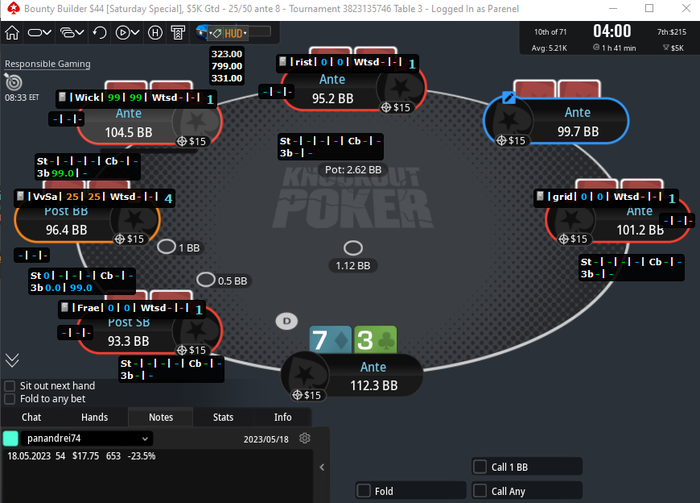 а вобще сегодня не выспался, не стоило садится играть, лучше бы поспал подольше. Запустил дорогую сессию и не складывалось да и тупил из-за недосыпа. В лучшем случаи в 0 отыграю если турик втащу