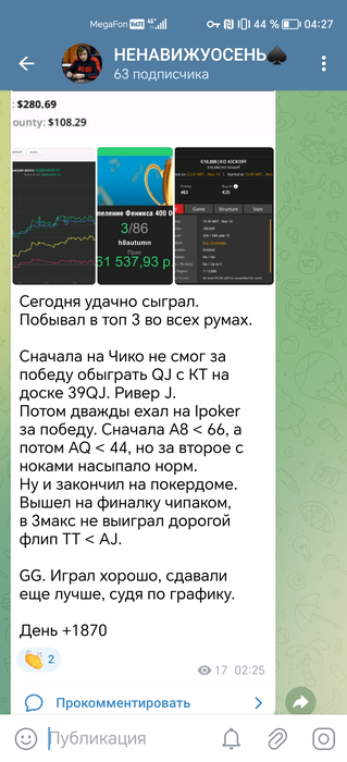 Покером нажили 6.5к на аби 30. До сих пор отключаю гг. Катаю айпокер, чико, впн и покердом. Пока нравится. Может быть с нового года буду возвращать гг, но это не точно. Винрейты кайф, форма кайф. Настраиваюсь на декабрьскую поездку в стены покерного клуба Сочи. Буду катать там от начала до конца.