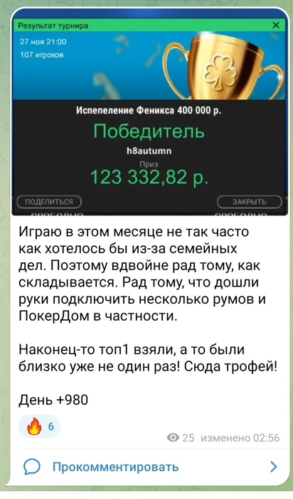 Начал добавлять турниры с баином 109 долларов. Потихоньку возвращаю уверенность в своих силах.