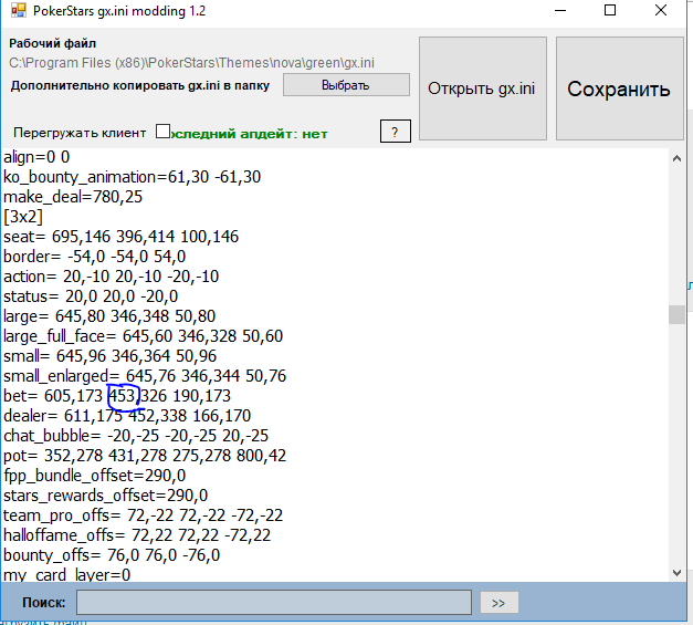 HighLifePro отмеченное это по горизонтали значение,следующее после запятой по вертикали к товей теме gx находится C:\Program Files (x86)\PokerStars\Themes\nova\green\style-P7