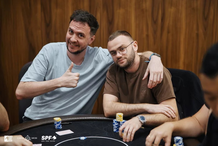 Никто не вылетел, никто не удвоился, нажили оба. У Константина и Ивана были одинаковые руки — . Уже на терне был 100% сплит.