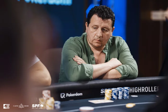 Дмитрий Сергеев — аут. Одновременно с этой раздачей случился вылет за TV-столом, и баббл лопнул без синхронных раздач.