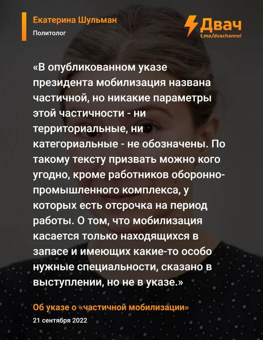 З.Ы.: Не уверен только за территории близкие к линии соприкосновения, там скорее всего будет объявлена полная мобилизация(со стороны кремля это кажется логичным). И если кто-то оттуда есть то скорее всего ваши варианты это съябывать или идти воевать.