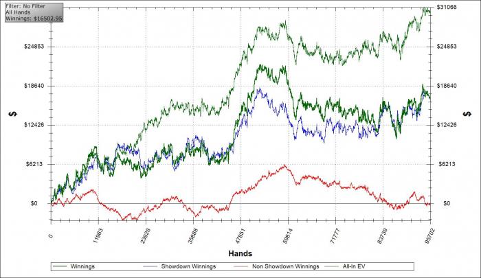 Потом кинул эту раздачу паре знакомых регов, чтобы показать, какой он нехороший человек. И, к моему удивлению, пара из них сказала, что это не был слоуролл, и он реально хотел сфолдить, т.к. флеш я бы ставил на терне, и поэтому репушить ривер буду только с A2, A5, 22 и AQ, и он в это время считал число комб, чтобы понять, плюсовой ли колл.