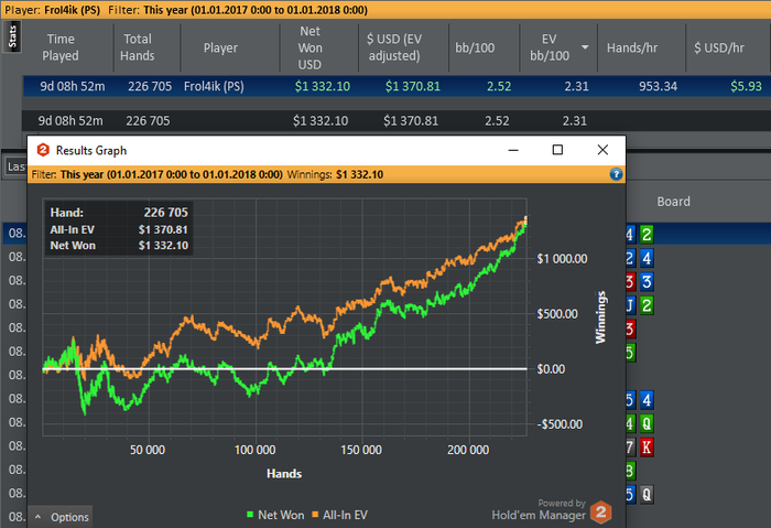 У меня всегда линии сходятся, как в аптеке. Наконец вернул скромную, но свою недодачу. Год я начал просто блестяще, январь -550$, а жрать хочется 24/7. Февраль отыграл <2bb EV. Ну хотя бы в плюс. Щас дела наладились. Да, я бы выбрал вместо +1,3k что-то другое, например +4k или +155k.