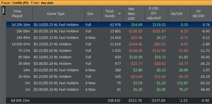 Ну видимо забил. Что-то совершенно не хочется туда возвращаться, с фр бы разобраться. Я же по-чуйке катаю, или это и есть тру или я не обучаем. Постоянно всякие мрази исполняют. То на 3беты 4бетят, то на цбеты не фолдят, стилы рестилят, лимп-3бетят хуеверят. И я заебываюсь смотреть на этот концерт. Если начну катать 6 столов, то наверное снова будет ёлочка. Надо бы поработать над игрой и тогда уже думать об сх.