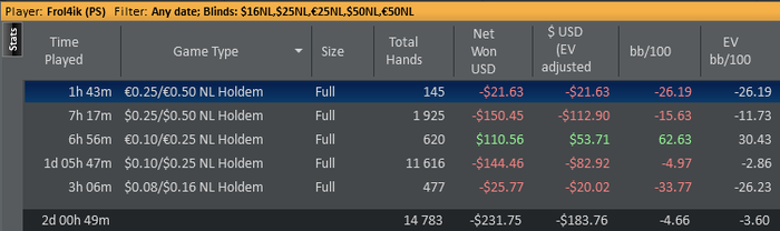Я сыграл за сентябрь 2015 - 144к рук в -440$, месяц стал худшим на то время. Спустя 1.5 года он считается самым худшим по чистому профиту. Самый худший в онлайне в сумме - январь 2017, -550$ кажется. Если интересно, то можно обе эти выборки найти в этом блоге.
