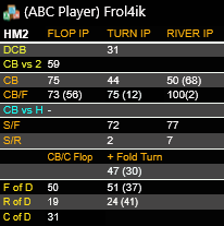5) Скип-фолд терна ИП 72%. Это когда не поставили цбет на флопе ИП и % фолда на ставку терна. Хорошее значение будет 50-60%, сколько точно я хз. Говорю по-опыту. Всегда нужно иметь среднюю стату, иначе будут эксплойтить. Если 60+% скажем, то я изи поставлю многие доски. Если 50-%, то значит опп хитровыебанный и надо быть осторожным. А что говорить о 72%? Это караул!!!