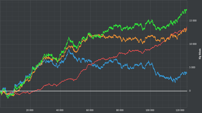 Поною немного. Вроде начал работать над игрой в солвере, как минимум 2 часа в месяц ему посвящаю стабильно, а прогресса все нет. Как выжить в этой игре, когда тебя окружают одни топреги. Каждый день я перед сессией себе повторяю: "Саня, хватит быть нитом, играй агрессивней, не ссы, они такие же люди". В итоге сажусь за столы и боюсь прожать любую кнопку, кроме кнопки фолд. Еще и даунстрик опять накрыл впридачу. Ладно хоть прошлогодний недобор начало отдавать.