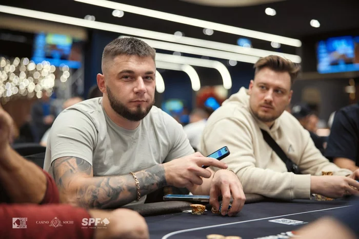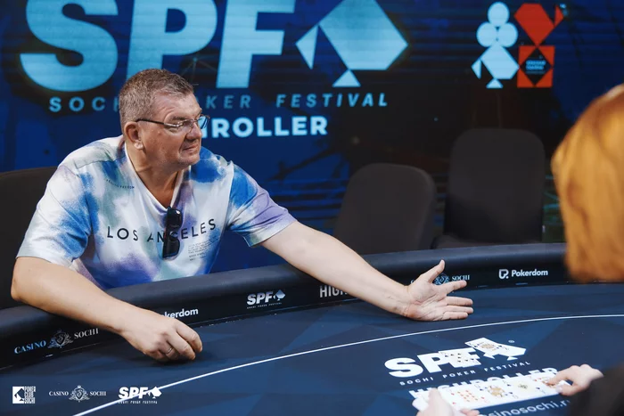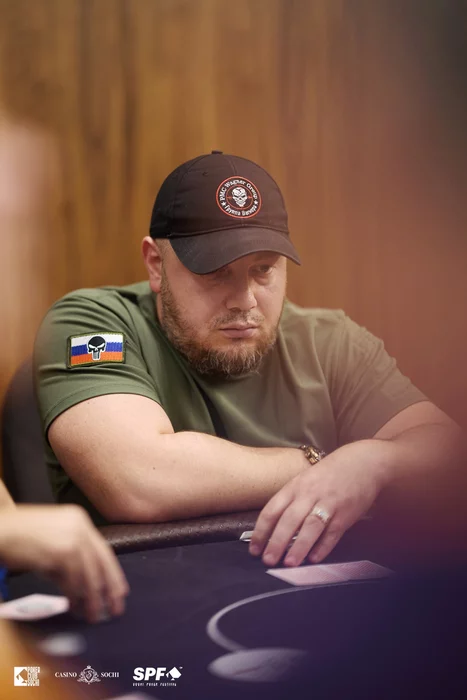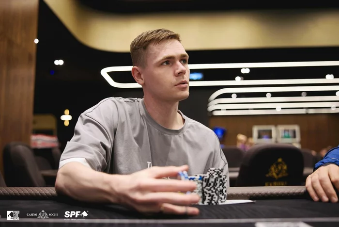 Следом Александр Буров открылся 18,000 с катоффа, Грицунов (22,000) с SB запушил , Давид Мирзоян (142,000) репушнул с большого блайнда, Буров сдался. Грицунов устоял и продолжил раскрутку.