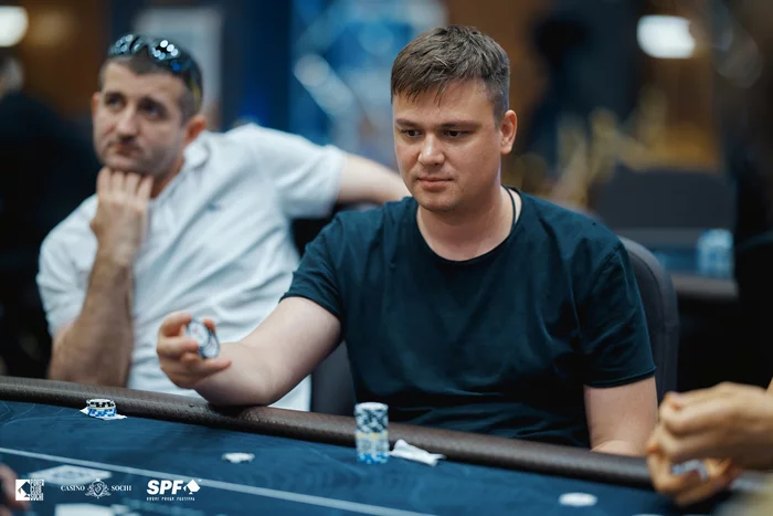 Стол 4. Александр Лахов (503,000) открылся 22,000 с первой, Павел Алексеев (52,000) поставил недопуш 50,000 с HJ. Лахов уравнял.