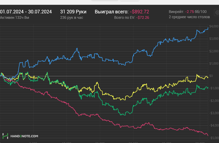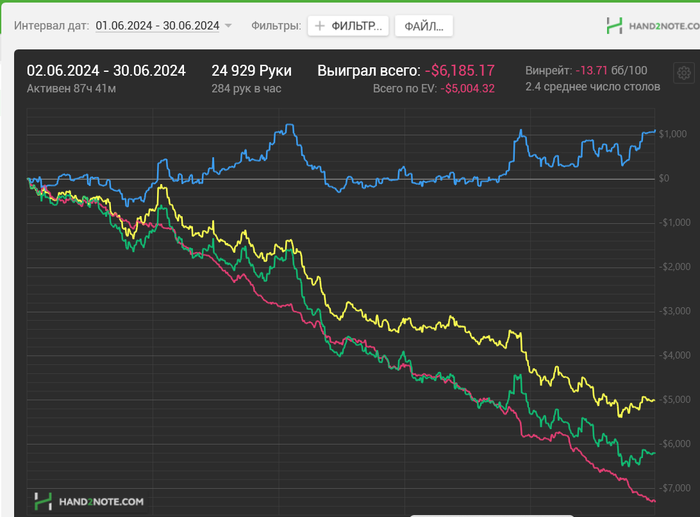 Я и не знал, что не выигрывать и не попадать АБСОЛЮТНО нигде за весь месяц (по факту уже третий месяц говна) это нормально. Я, раньше думал, что когда реги выкладывают такие позорные графики я думал: "пацаны, блефовать не пробовали?" Оказывается, когда пробуешь, получаешь пуши в ебальничек каждый раз. По кассе -2300$