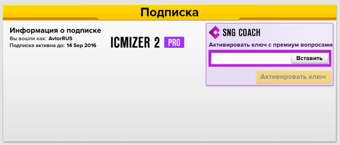 Здраствуйте , Я оформил покупку Icemaizer 2 pro на 12 мес + 5000 вопросов ,с активацией проги всё хорошо , а вот с 5000 вопросами проблема , где Я могу проверить статут активации 5000 доп вопросов ? 2 ключа на руках , но инфа только о подписки толко о про 12 мес . скрин ниже . К слову код активации на 5к вводил именно в это поле сиреневого цвета . Или при достижении базового лимита в 120 вопросов , он автоматически переключит на доп 5000 ?Заранее спасибо. Артём
