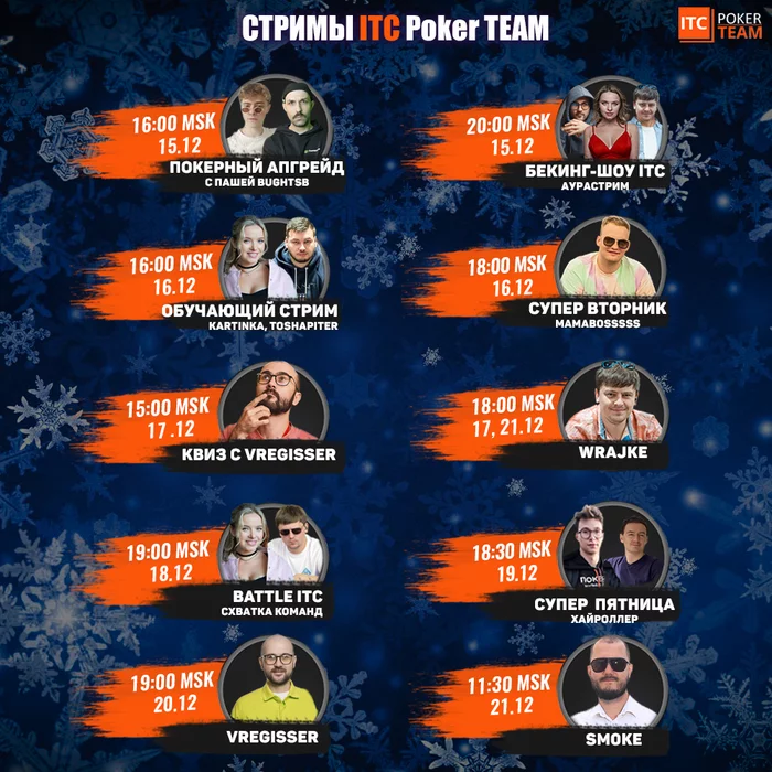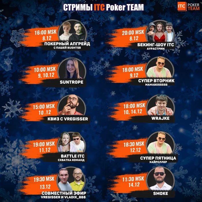 Расписание стримов ITCPokerTEAM на предстоящую неделю (время мск):