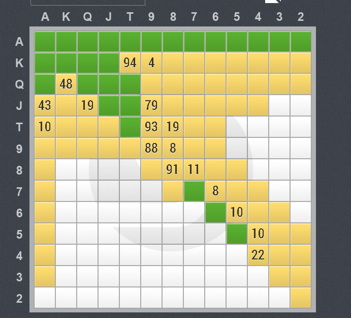 Выходит что и у самых топ регов разноматные тузы многие играются оч плохо на сайзинг равный 2.5бб и выше, а разномастные руки с 8х и хуже с они колят не часто, а то что колят играется плохо. Я не знаю прав ли я, но мне кажется что на моих лимитах с все еще высоким рейком и с моим уровнем игры, проще будет защищаться по - тайтовее. Вот я накидал примерный диапазон защиты (кол+3бет) на сайз 2.5бб (взял самый распространенный размер)