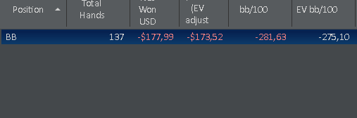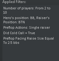 Вобщем ковыряюсь дальше в базе. Явно что то не так с защитой бб. Начал смотреть по фильтрам какие руки как играются коллом. Впервую очередь, конечно, против бтн. Заметил что руки типа мелких разномастных тузов и разномастные руки с нижней картой ниже 9ки играются хуже чем -100бб. Пробил по разным сайзингам и понял что против рейза мельче чем 2.4 бб эти руки играются более менее, против конкретно 2.5 играются плохо, против более крупных типа 3бб и выше понятно что вообше ужасно. Еще некоторые худшие одномастные играются плохо, но тут не так критично