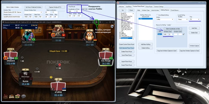Мои действия: Нажимаю на вкладку "Custom Poker Room", далее нажимаю на кнопку " Сrete Custom Poker Room", называю его "GGpokeroOK", далее во вкладке " Auto-Activate" нажимаю на кнопку "Start Window Capture" - "Click to SelectWinows" - "Capture Windows (F11)" (cделали снимок стола). Нажимаю на интересующую меня кнопку на столе (кнопка "Лобби"). Захватываю координаты этой кнопки (839; 15).