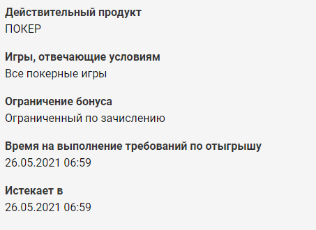 Бонусы нужно успеть отыграть до этой же даты. Неиспользованные билеты, турнирные доллары и очки программы лояльности будут автоматически конвертированы в кэш.