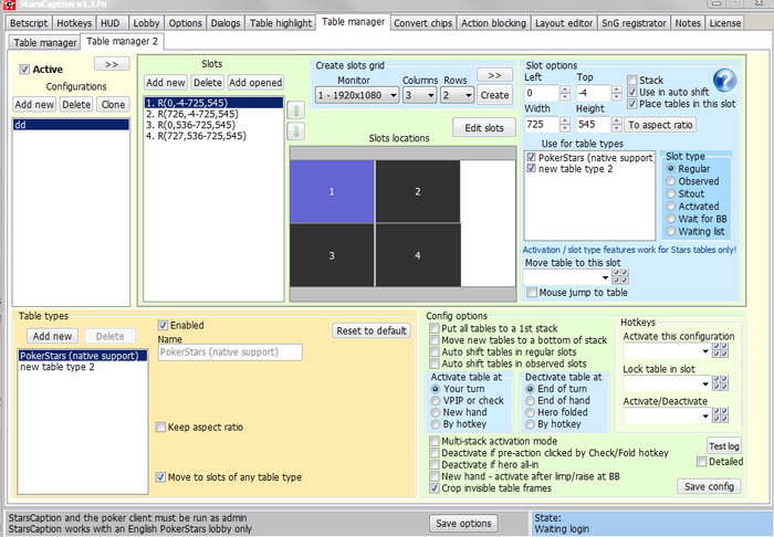 1. Table manager 2 в StarsCaption расставляет столы Winamax с дефолтным конфигом? (добавленным при помощи Table types / Reset to default)