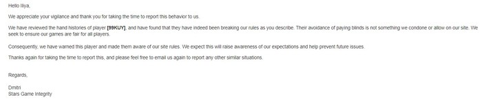 29/09/2019 player "Sigmfreud" from 23 till 00 MSK time avoided to play poker, every time leaving 4 max table and starting new table. At the new table he also avoided to play, every time created new. I guess its against concept of poker rooms - "Its supposed to play poker, if you join the table" Please warn him, that this behaviour is inappropriate.