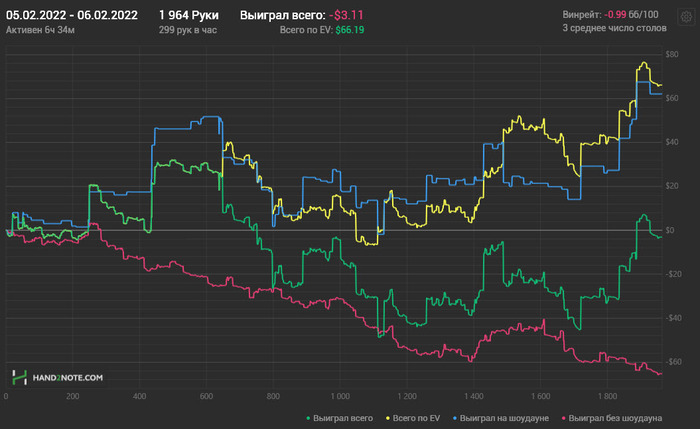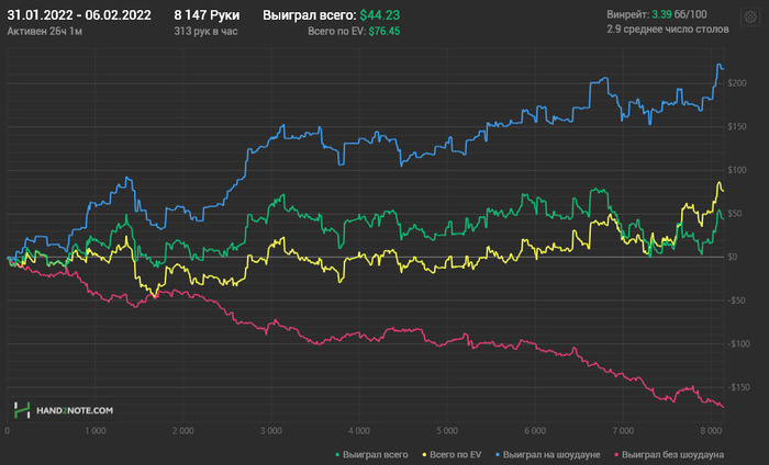 Нет времени играть особо. Да и теорией заниматься нет времени - дочка болеет, надо вместо покера с ней сидеть, лечить. Поэтому и отчет сегодня краткий - самому посмотреть что наиграл - стал меньше смотреть в кассу в процессе игры (да и графики только когда для отчета делаю). Не знаю, для меня это +EV или нет. Вроде нет нужды смотреть, а вроде лучше и смотреть - минус не нервирует особо (думаю), а плюс не заставляет играть тайтовее - зато любопытство "ну что там?" удовлетворено.