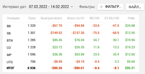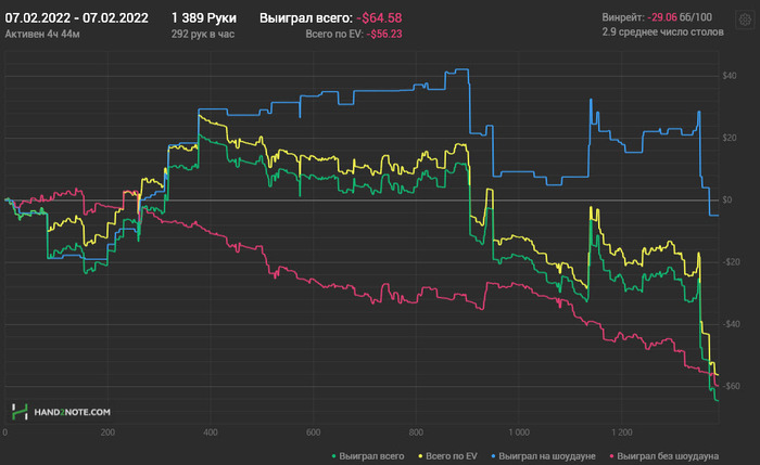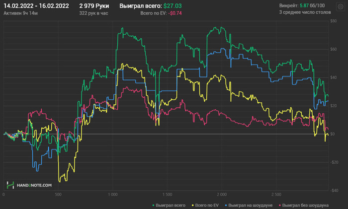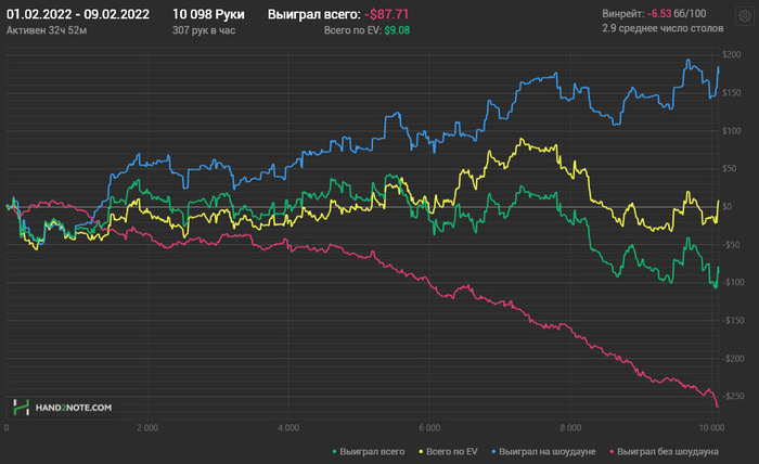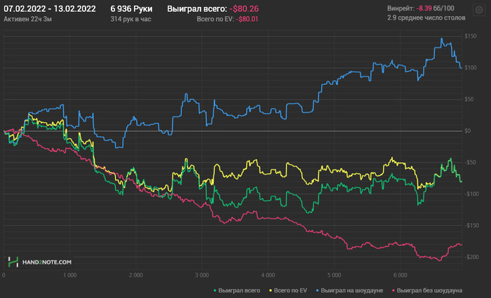 Разобрал вчерашнюю игру. Явных ошибок на -248 бб. Лишние коллы, в основном, где уже явно позади. И это еще результат того, что откровенно вчера мысли были совсем не про покер.