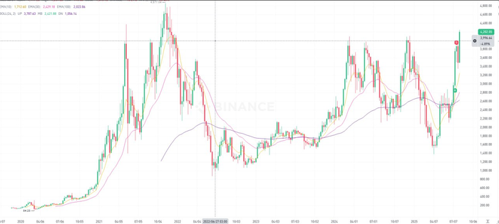 В прошлом году эфир трижды отбивался от уровня 4000 - 4100. А сейчас легко на одном дыхании пробил этот уровень и сейчас закрепился на 4200. Тут уже до АТН в 4900 недалеко.