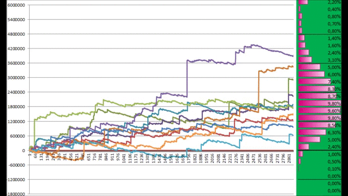 40%, что заработаем больше, чем ЕВ. Неожиданно: наша "зеленая" будет выше нашей "оранжевой" существенно реже, чем наоборот. Т.е. МТТшники заранее обречены на то, что что темные полосы в жизни будут у них шире, чем у кешевиков. Зато светлые - ярче.