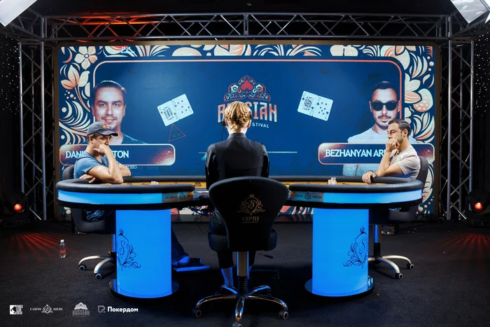 На начало хедз-апа у Арена Бежаняна было 52bb в стеке, а у Антона Данилова — 15 bb. Антон уже выходил в хедз-ап турнира High Roller на этой серии, но там все закончилось в одну раздачу, потому что Антон был в авто олл-ине.
