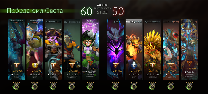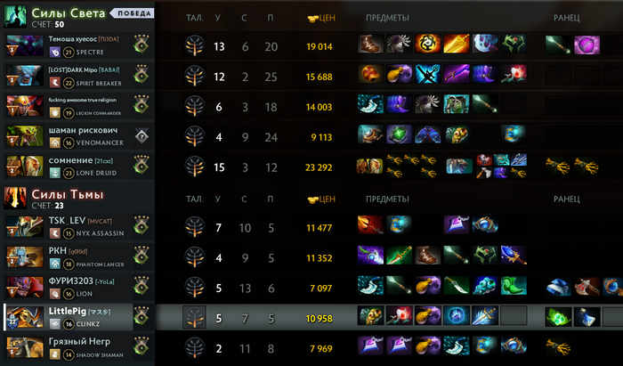 LittlePig, решил финальную сыграть)) мидер 7к урона(вивер), 3ка троль 6к урона, разнылся с нулевой, что пудж в бане, они вдвоем лес дрочили всю игру))) это минут за 40)) а ты про сапов которые глимер, еул не взяли😁😁😁 и это легенды😆😆😆