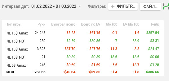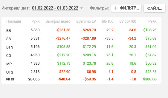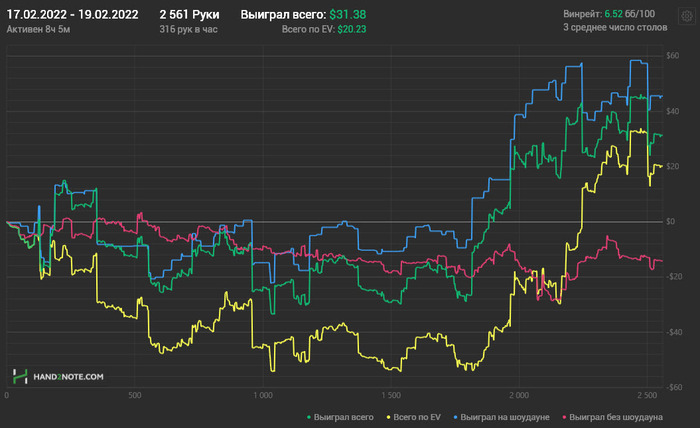 2 недели тестового периода - сплошная боль! В общей сложности -16 БИ аналога нл20 (отыграл 10к рук). Причем каждый день по -1..-1,5 БИ. Но по EV -10 БИ. Что немного облегчает боль (как бы).