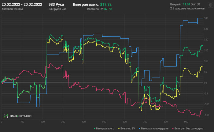 нл10 я играю днем, когда на нл16 игры нет совсем для меня. И решил, что это пустая трата денег. 2,3к рук - это ничто, конечно. Но -2БИ моего рабочего лимита - это уже жалко. Пришла мне в голову идея, что можно попробовать нл25 поиграть, но нет уверенности, пожалуй - нл16 в ноль игра у меня.