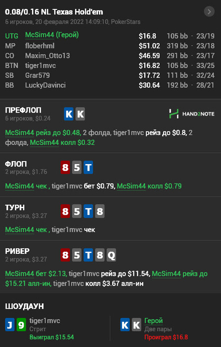 timbler12 @ 21.02.22Ну с КК я всегда их стараюсь запихнуть префлоп, неважно какой опп. С 77 я на префлопе ни когда не выкину на таких позициях.И ривер подумал между чек коллом и чек фолдом.