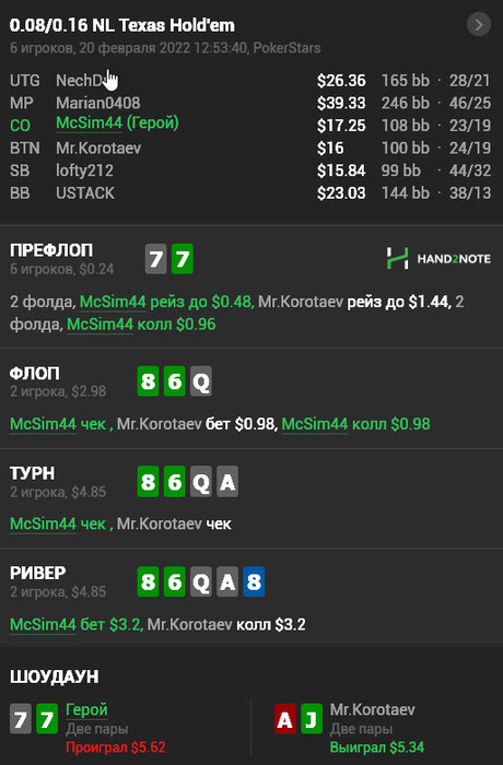 Ну с КК я всегда их стараюсь запихнуть префлоп, неважно какой опп. С 77 я на префлопе ни когда не выкину на таких позициях.И ривер подумал между чек коллом и чек фолдом.
