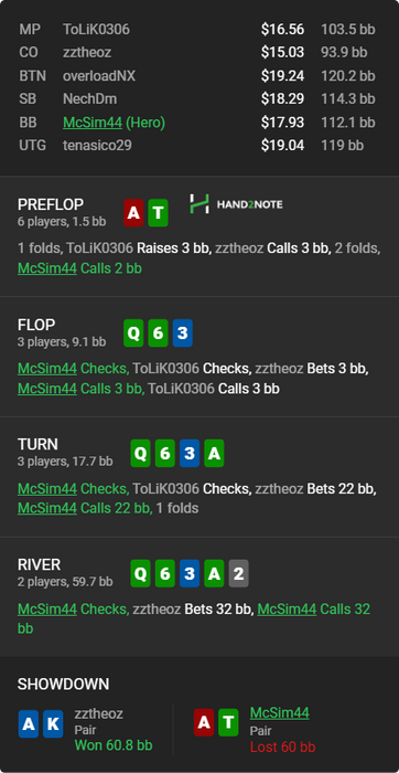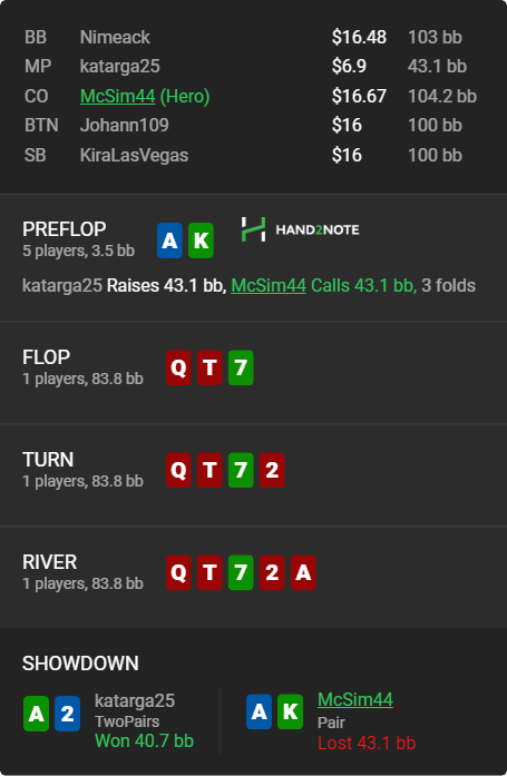 2. с АТо можно вообще не колировать в мультипоте, либо сквиз либо фолд, но терн уже фолдить надо бы на таккой сайз- поц ставит овербет и еще в двоих