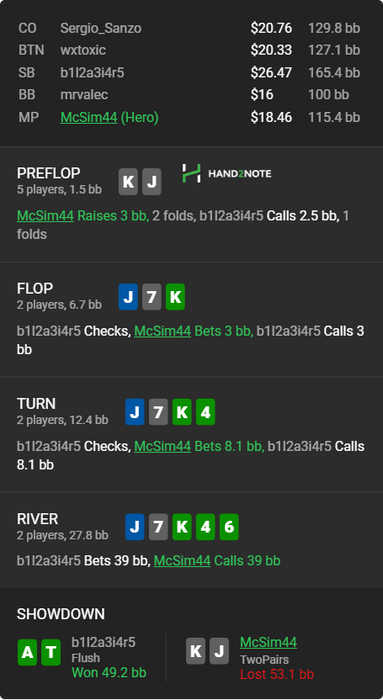 Тут просто взял и заколил терн и ривер. Типа фиш - 61/0. Рук 39. Флаши блочу, но и блефы типа KT, JT блочу. Я решил, что он может слабого туза переиграть. Но все в ошибки. Так играть не стоит.