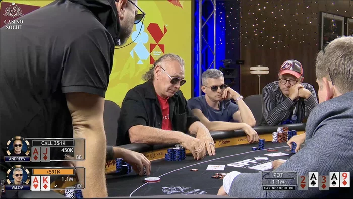 А вот Артем Корогодов начинал день с одним из самых коротких стеков, но смог выиграть важный тройной олл-ин с QJ против АА и АК, а дальше только наращивал стек.
