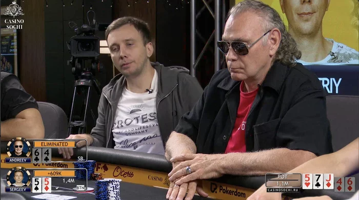 Начинавшие день в топ-3 чипкаунта Владимир Перцев и Сергей Чудопал тоже на финалке, но путь у них получился разный. Чудопал стабильно наращивал стек без особо крупных раздач, а Перцеву в моменте пришлось тащить свои ауты на ривере.